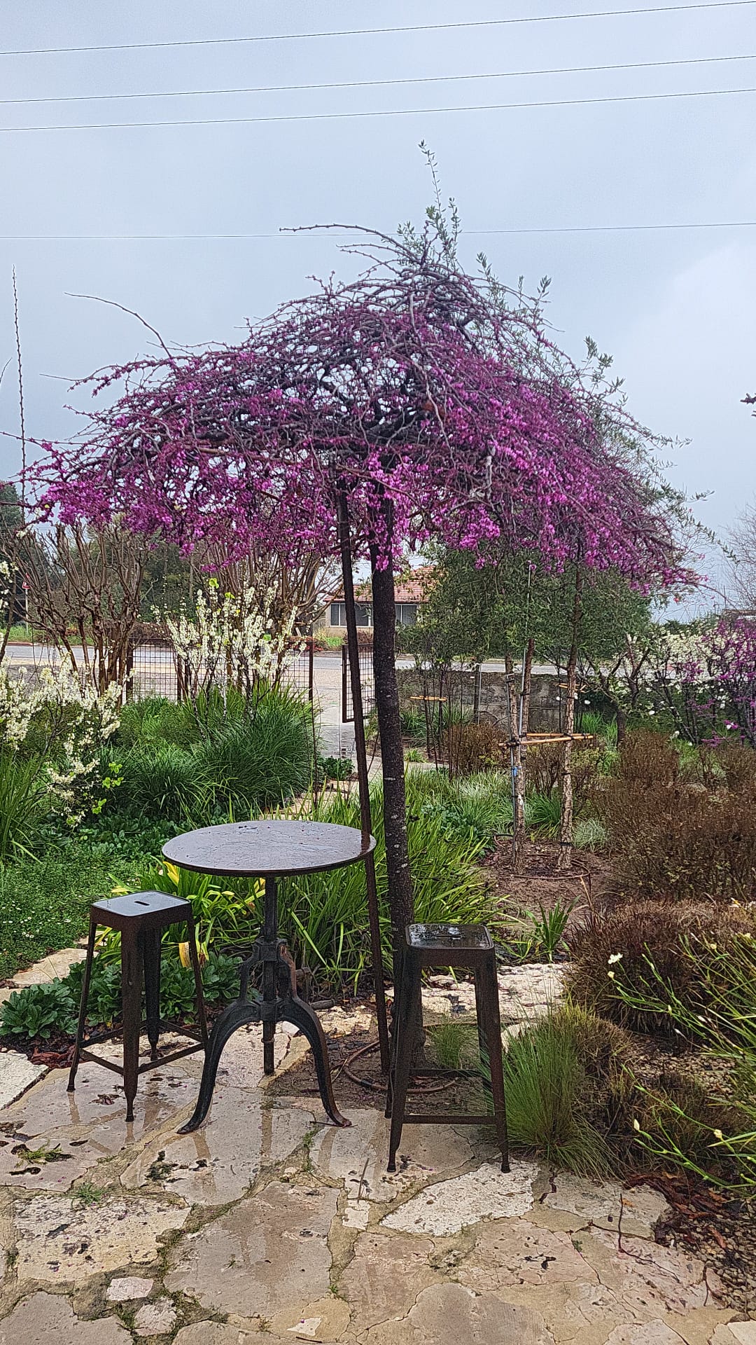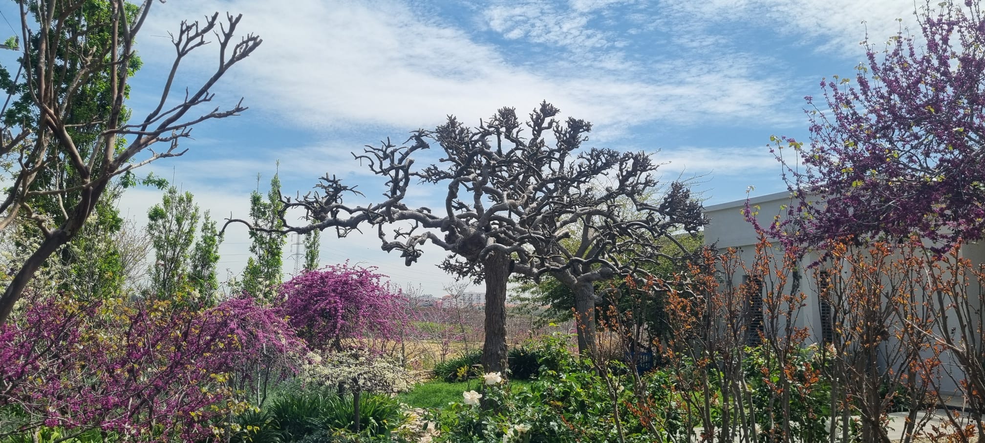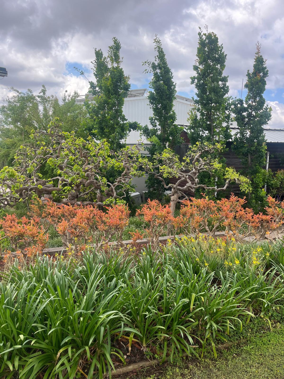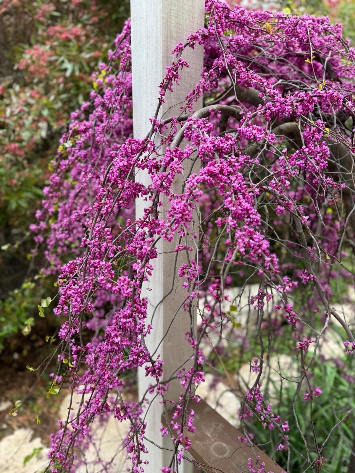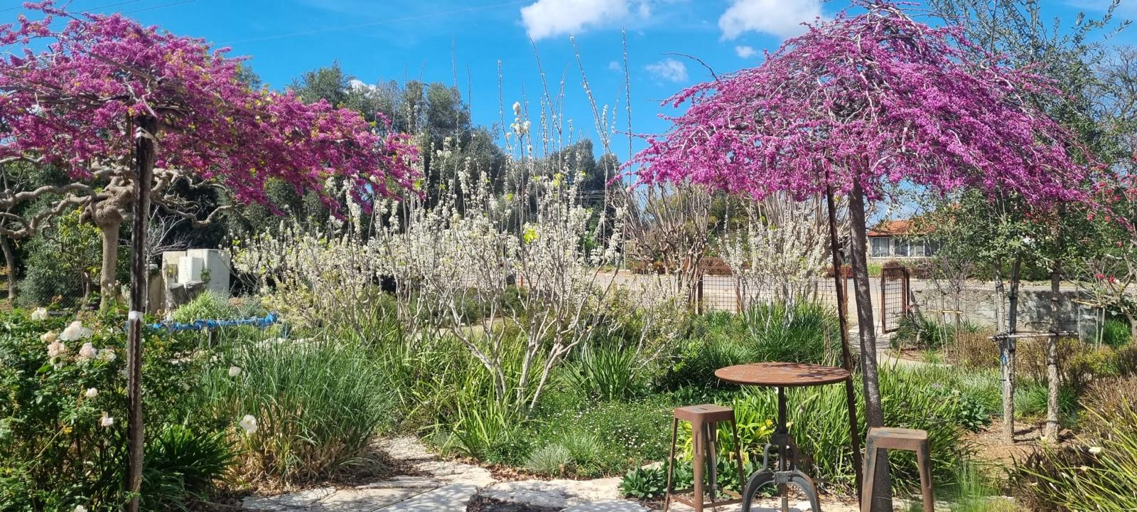 #צמחים/עצים בגינה: כליל לבן שירובנה, כליל טקסס וייט , כליל ונילה טוויס, כליל סגול אוקלהומה וכליל טרוולר, אפרסק נוי , ספיון שעווה זן שלהבת