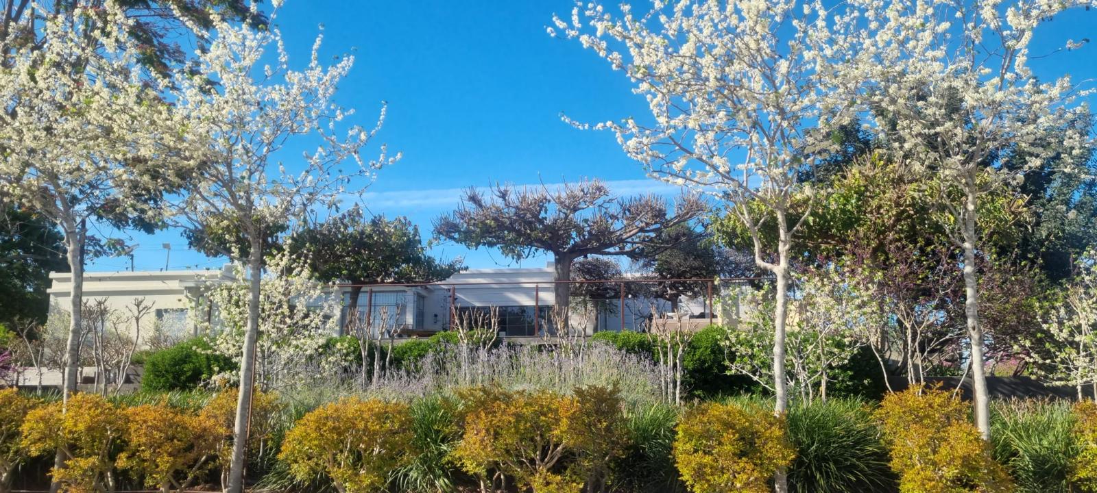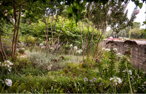 בין גזעי לגרסטרמיה רב-גזע ניצבים פרחי האגפנטוס לבן, המשתלבים ברקע ירוק עשיר של שיחים וצמחי תבלין. הבחירה בצמחייה מגוונת ובגובה משתנה יוצרת מראה טבעי אך מוקפד, המדמה גן ים־תיכוני פראי. שבילי מבט נפתחים בין הצמחים, ומזמינים את המתבונן להלך עם העין ולגלות את הרבדים השונים של הגינה.