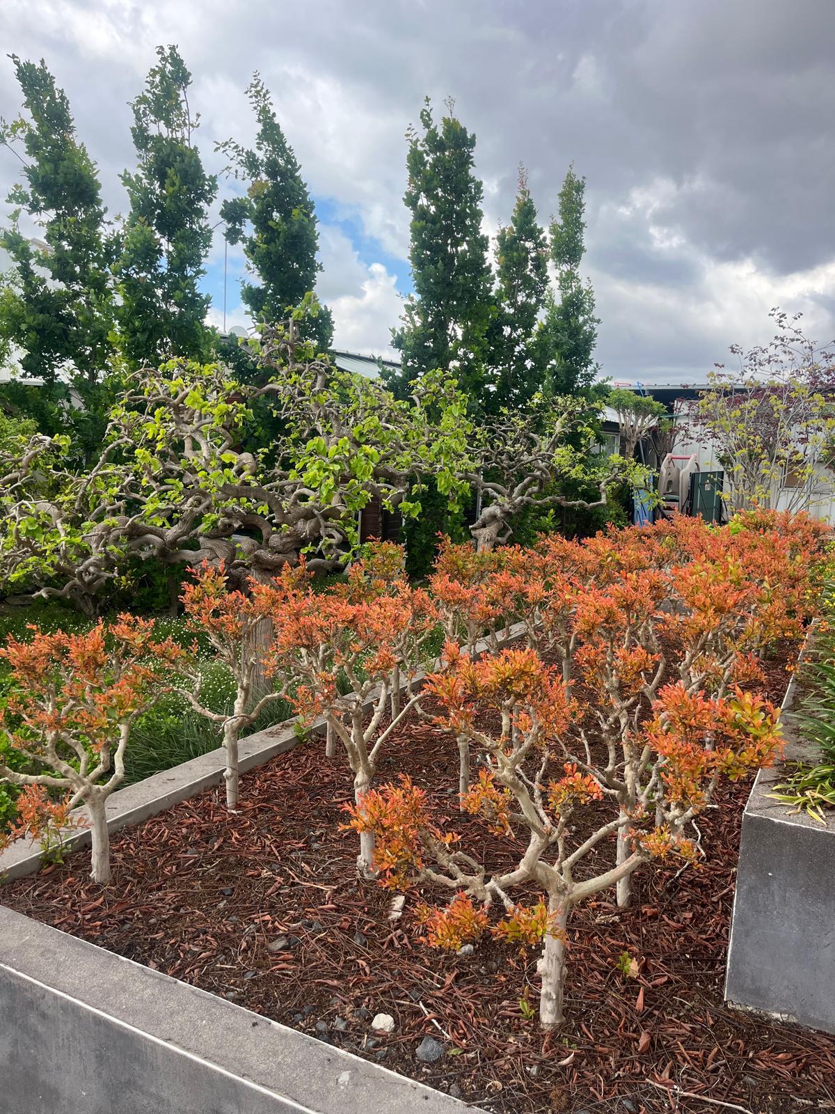 לגרסטרמיות ננסיות זן קורדון בלו מורכבת על גזע 40 ס"מ. לבלוב עלים צעירים בגווני צהוב-כתום מקנים נוכחות זוהרת בגינה. סידור סימטרי על הטרסה יוצר מוקד צבע, כוח- על רקע פרגולות עץ התות.